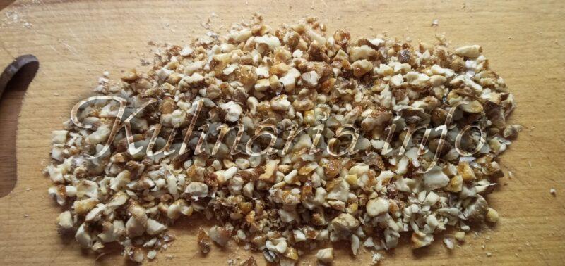 Залишаю на 10-12 хв. Заливка надає тісту не соковитості, а й приємного аромату. Цієї порції абсолютно достатньо. Переношу пиріг на блюдо та бсипаю подрібленими горіхами.